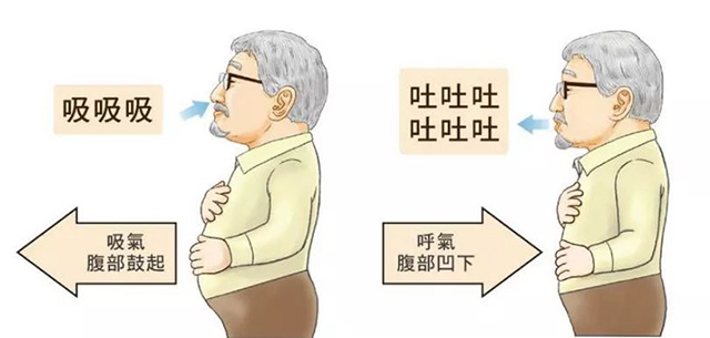 吸氣時(shí):采取仰臥或舒適的坐姿,可以把一只手放在腹部肚臍處,放松全身,先自然呼吸,然后吸氣,最大限度地向外擴(kuò)張腹部,使腹部鼓起,胸部保持不動(dòng)。