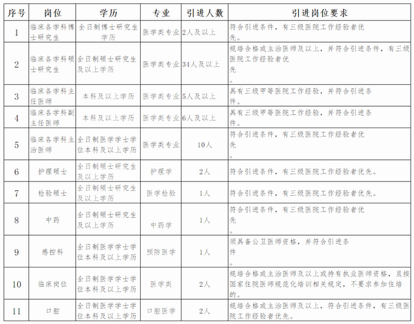 招聘計劃崗位66名及以上,其中臨床各學科博士研究生2人及以上、臨床各學科碩士研究生34人及以上、臨床各學科主任醫師5人及以上、臨床各學科副主任醫師6人及以上、臨床各學科主治醫師10人、護理碩士2人、檢驗碩士1人、中藥1人、感控科1人、臨床崗位2人、口腔2人。