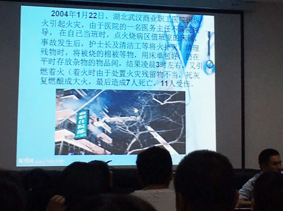 姜斌老師重點(diǎn)圖文并茂地講解了歷年醫(yī)院的火災(zāi)案例,并結(jié)合我院的情況講述醫(yī)院火災(zāi)的特點(diǎn),就如何做好消防安全防護(hù)工作以及火災(zāi)的預(yù)防與撲救工作做了詳細(xì)介紹。