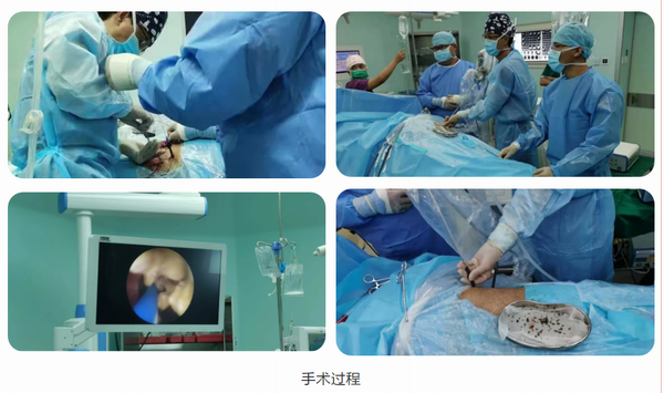 經過臨滄市中醫院醫院外科、麻醉科和手術室的醫護團隊的共同努力,患者的術前準備在入院一天后全部完善。2020年12月24日,患者的經尿道左側輸尿管鏡下鈥激光碎石取石術+右側經皮腎鏡多通道鈥激光碎石取石術+雙側輸尿管鏡下內支架植入術有條不紊的開始了。隨著全身麻醉成功后,寸玉先醫師首先迅速完成了經尿道左側輸尿管鏡下鈥激光碎石取石術+左側輸尿管鏡下內支架植入術。變換體位,再次消毒鋪巾后,寸玉先醫師迅速建立右腎后組下盞工作通道,緊接著又順利建立了右腎上盞工作通道,正式開始斬斷嚴重影響患者健康的“鹿角”。內鏡通過細小的微創通道進入右腎腎盞后,正式和患者的鹿角形結石短兵相接。