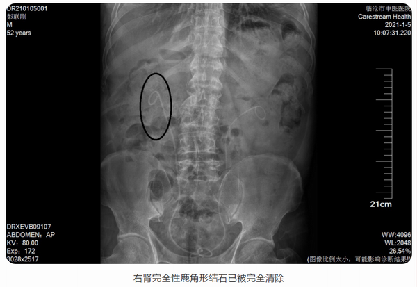 右腎完全性鹿角形結石負荷過大且右腎濾過功能尚可,結石長期刺激尿路上皮有癌變風險,結石梗阻可能導致腎功能損害,且易繼發感染,感染又易進一步繼發結石,產生惡性循環?;颊叩牟∏槭菑碗s且嚴峻的,經過臨滄市中醫醫院外科各位專家仔細論證,患者可予以多通道經皮腎鏡鈥激光碎石取石術。