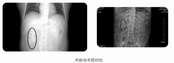 在寸玉先團隊和麻醉科手術室醫護的攜手努力下,經過四個多小時的奮戰,患者的手術圓滿完成。2020年12月24日平安夜,患者和家屬拿著從患者右腎粉碎取出的一袋結石,滿心歡喜,表示這是今年他們收到的最滿意的禮物。患者術后恢復迅速,術后第一天就正常飲食和下床活動了。術后復查影像學檢查證實完全清除了殘余結石。