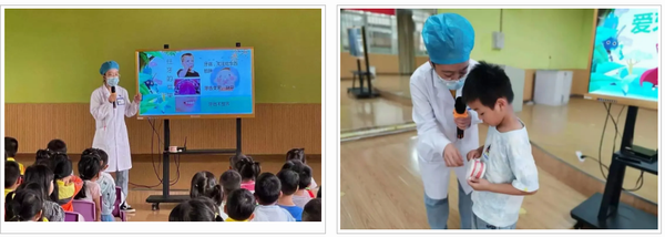 施醫生結合幼兒的年齡特點,以播放生動形象的動畫PPT及動畫視頻向幼兒耐心細致地講解了牙齒的結構、作用,介紹了愛護牙齒的重要性以及如何保護牙齒、幼兒換牙階段要注意的事項等知識;針對正確的刷牙方式進行了現場演示。